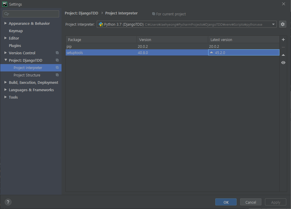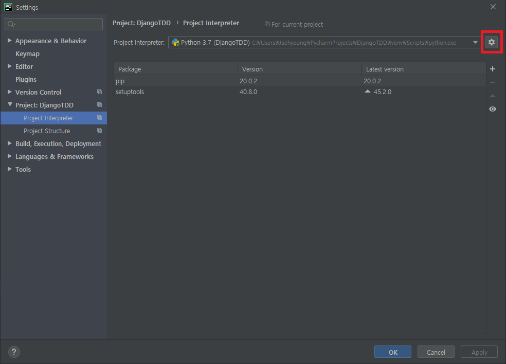 File-Setting을 클릭한 뒤, Project:프로젝트 이름-Project Interpreter를 클릭하면 다음과 같은 창이 생성됩니다.