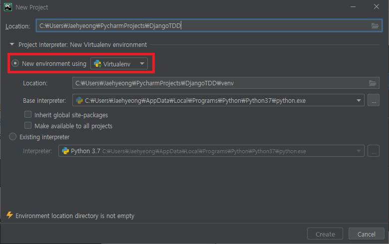 여기에서 Virturalenv Environment-New environment를 클릭하면 가상환경으로 프로젝트가 구성됩니다.