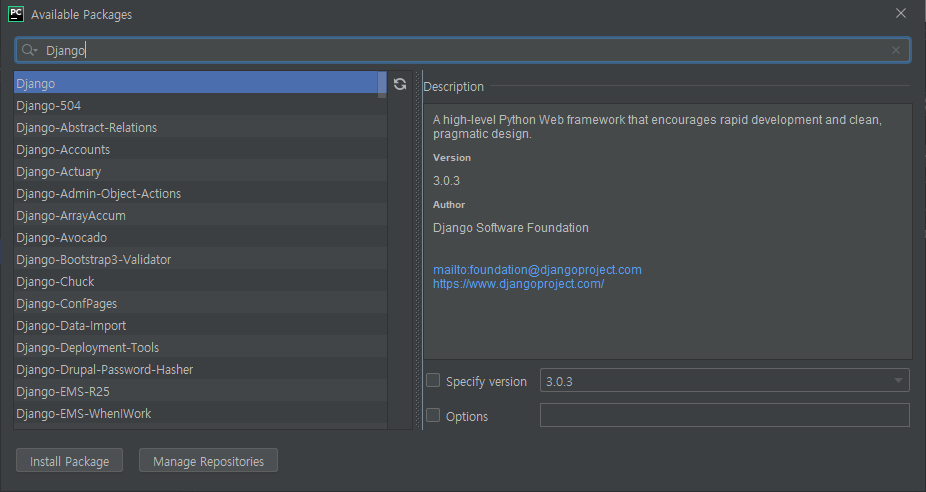 +를 클릭하면 나타나는 창에 Django를 입력합니다.
