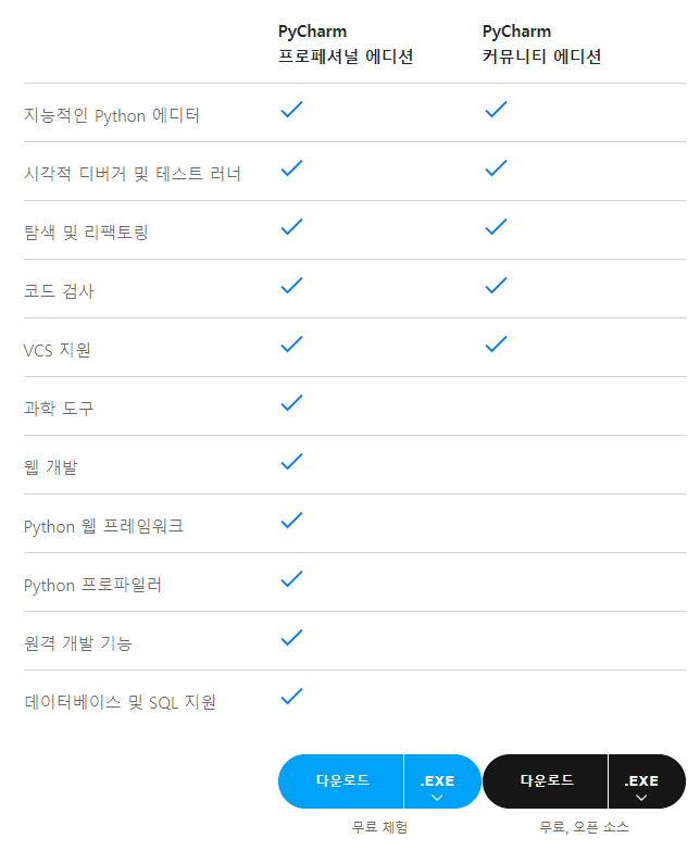 Pycharm은 python을 사용하기에 좋은 IDE입니다. 하지만, community(무료)버전은 제한이 있습니다. JetBrain pycharm내 차이점을 보면, 웹 개발, 웹 프레임워크, SQL 지원이 빠져있습니다. 참고사이트[1]에 따르면 커뮤니티 버전에는 "자바스크립트 하이라이팅, 다국어 파일 지원, html 파일 링크 등 몇 가지 기능"이 빠져있다고 합니다. 모든 기능을 사용할 수 있는 프로페셔널 에디션은 년간 $199를 지불해야 함으로 조금 비쌉니다.