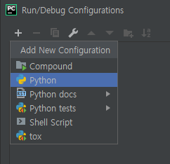 +를 클릭한 뒤, Python을 클릭합니다.