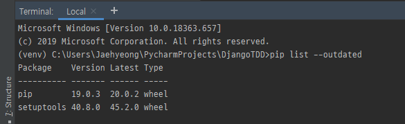 pip와 setuptools의 업그레이드가 가능한 것을 볼 수 있습니다. 업그레이드를 위해 명령어를 입력합니다.