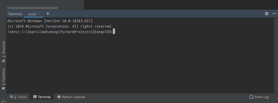 Pycharm의 터미널(단축키: Alt+F12)를 클릭하여 터미널을 실행합니다. (venv)라고 적혀있는 부분이 현재 가상환경에 접속되어 있음을 알려줍니다.