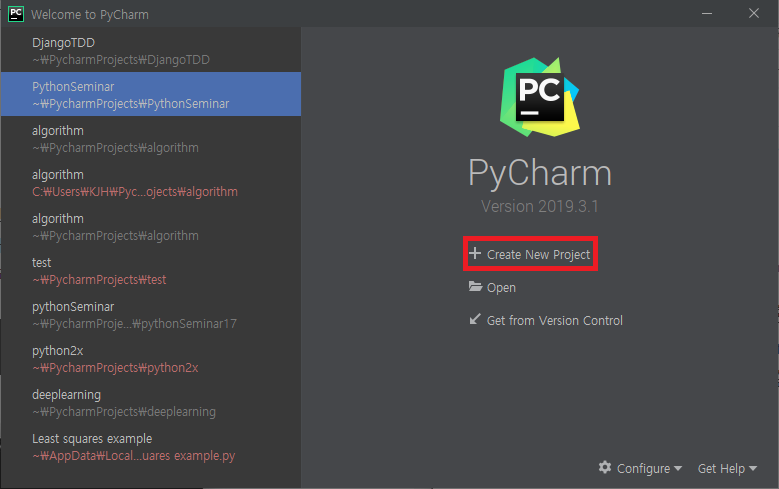 PyCharm project를 생성하기 위해 Create New Project를 선택합니다.