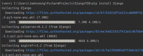 가상환경에는 python이 연결되어 있고, pip가 설치되어 있습니다. pip를 통해 Django를 설치합니다.[2][6]